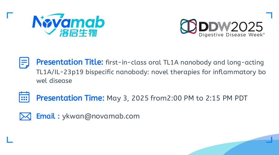 中国上海,2025年4月28日——上海九州ku游官网生物医药技术有限公司,一家致力于纳米抗体创新药研发的生物技术公司宣布:九州ku游官网生物将于当地时间5月3-6日参加在加利福尼亚州圣地亚哥举行的2025年美国消化疾病周(Digestive Disease Week,DDW)。届时九州ku游官网生物将展示在炎症性肠病(IBD)治疗领域的突破性研究成果——口服TL1A纳米抗体及长效TL1A双特异性抗体的开发进展。该创新疗法顺利获得独特的TL1A纳米抗体技术,实现了对IBD病理机制的精准靶向。